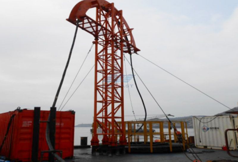 退扭架高15m,退扭架顶部滚轮弯曲半径3m;为便于运输和(hé)安装,退扭架由4部分组成,其中支(zhī)撑架(jià)由3部分组成,分别为:7m/3m/2m,滚轮架1套;退扭架各组(zǔ)成(chéng)部分之间由(yóu)连接法兰连接,退扭架组装完后使用4根钢丝绳(shéng)与甲板连接,保证退扭架的稳性(xìng)。